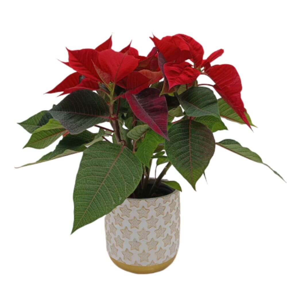 Gwiazda Betlejemska czerwona w ceramicznej osłonce zachwyca czerwonymi kwiatami, które symbolizują świąteczny czas. Gwiazda betlejemska ustawiona w eleganckim kwietniku doskonale dopełni bożonarodzeniowe dekoracje.