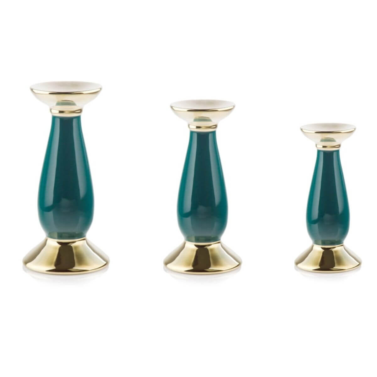 Świecznik ceramiczny Emerald w stylu glamour w modnym zielonym kolorze jest stabilny i uniwersalny. Możesz eksponować na nim świece bryłowe, tradycyjne, jak i kule ceramiczne. Ciekawym rozwiązaniem będzie zestaw w różnych wielkościach świeczników. Doniczka ceramiczna Emerald Cylinder niebieska lub doniczka ceramiczna Emerald Łódka zielona to również doskonały zestaw dla świecznika.